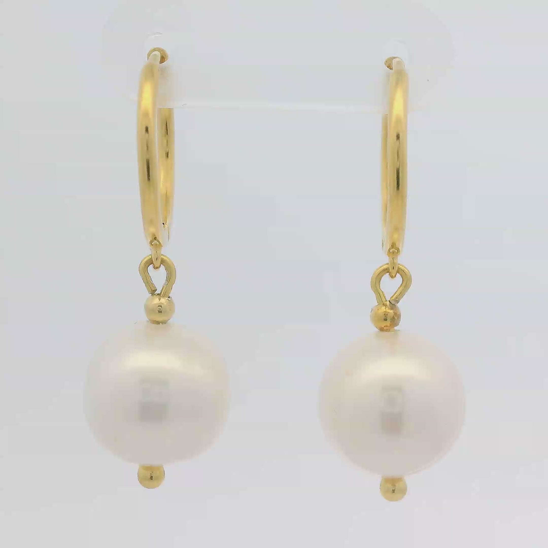 Entdecken Sie den zeitlosen Charme dieser Perle Weiss 12 mm Ohrhänger, welche an 14 mm Creolen mit Steck-Verschluss aus Silber 925 und gelbvergoldetem Silber 925 befestigt sind. Die perfekte Kombination aus schlichter Eleganz und hochwertigen Materialien für jeden Anlass.