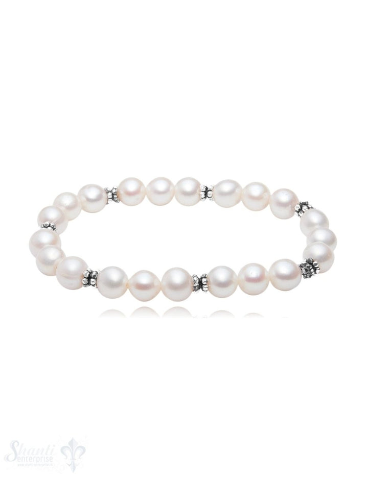 Perlen weiss Armand 8 mm mit Silberteile geschwärzt 18 cm auf Elastik